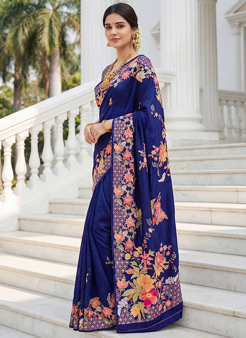 Premium russian silk saree with floral position print – wedding & festive wear