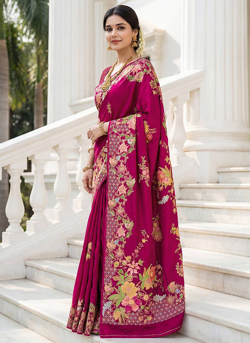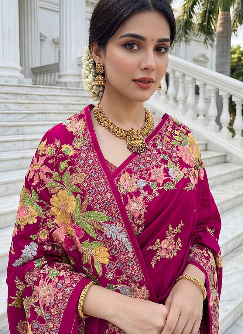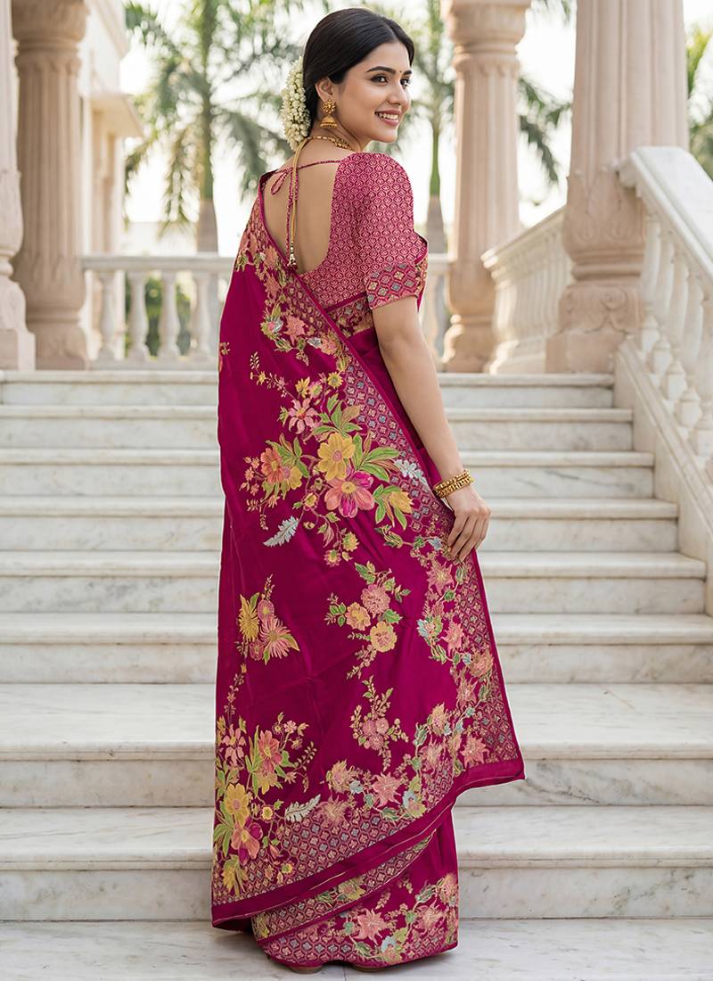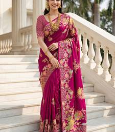 Rani pink russian silk saree with designer position print – premium wedding collection