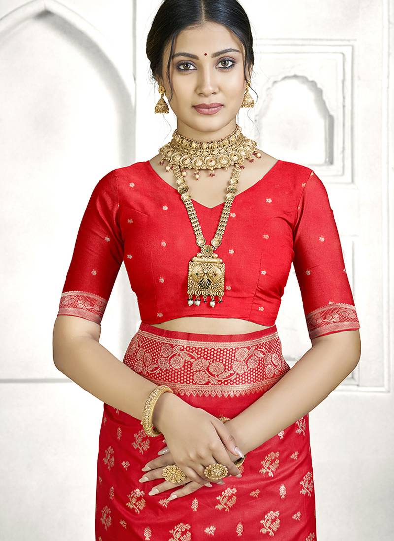 | Product Description | Elevate Your Ethnic Wardrobe With This Stunning Red Banarasi Silk Saree, Beautifully Crafted With Rich Zari Weaving That Reflects Timeless Indian Artistry. Woven From Luxurious Banarasi Silk, This Saree Features Intricate Traditional Motifs Spread Gracefully Across The Body, Complemented By An Opulent Zari Woven Border And Pallu That Add A Royal Charm. The Vibrant Red Hue Symbolizes Elegance And Celebration, Making This Saree A Perfect Choice For Weddings, Bridal Wear, Festive Occasions, Receptions, And Traditional Ceremonies. Its Smooth Texture And Graceful Drape Ensure Both Comfort And Sophistication, While The Detailed Zari Work Enhances Its Premium Appeal. Pair It With Traditional Gold Jewelry To Complete A Classic And Regal Look That Never Goes Out Of Style. |