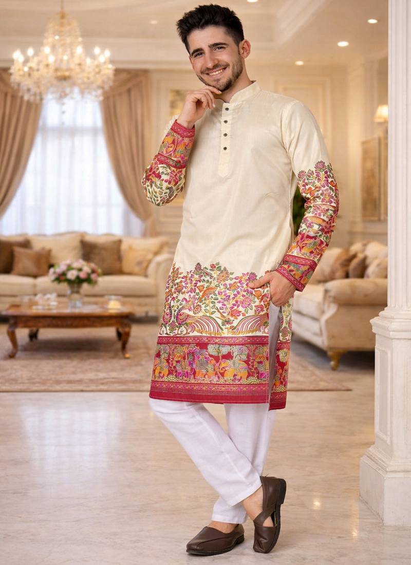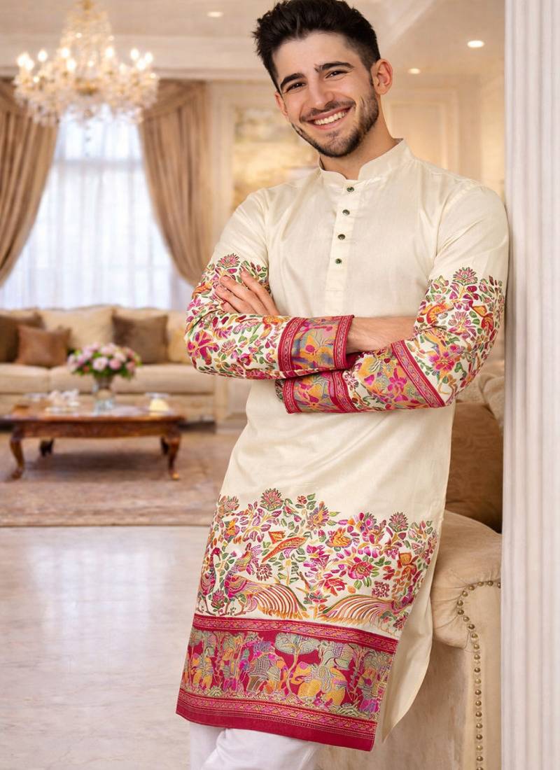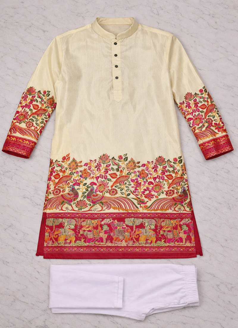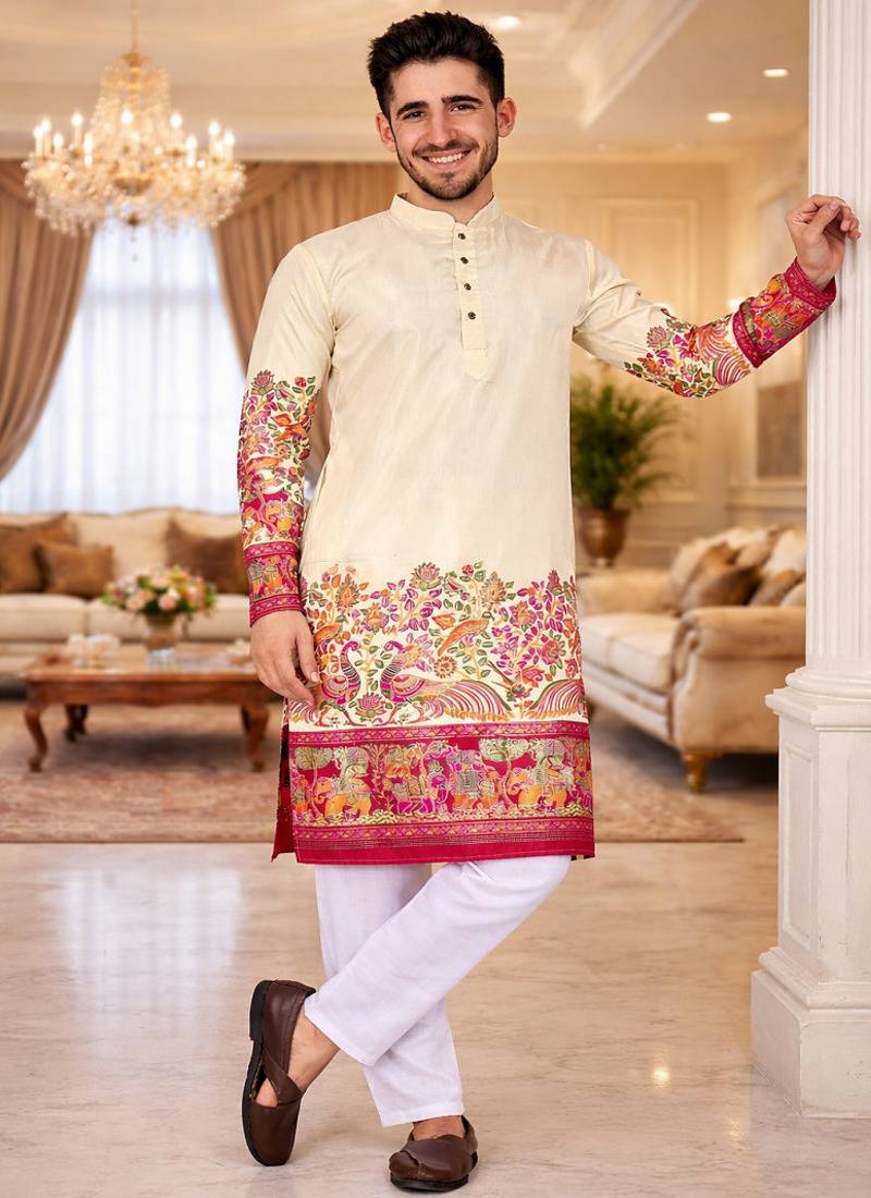 | Product Name | Off White Patola Foil Print Dola Silk Kurta Pajama Set For Men | Elegant Festive Wear | |