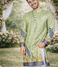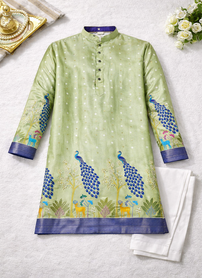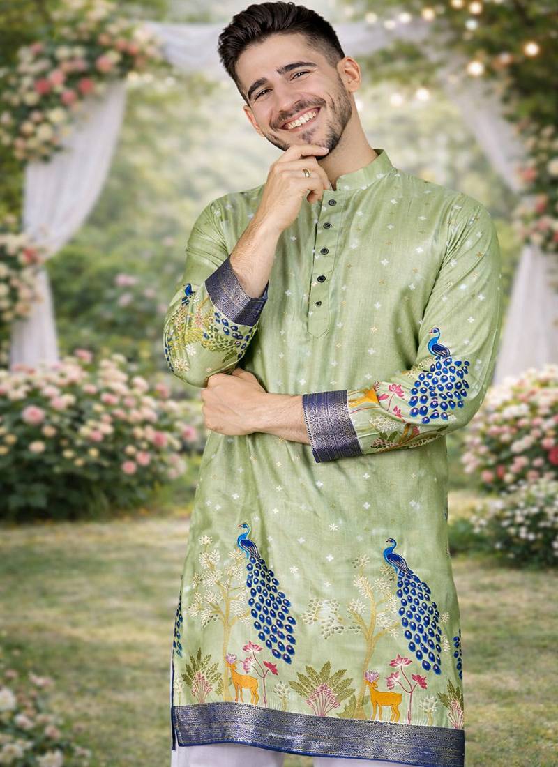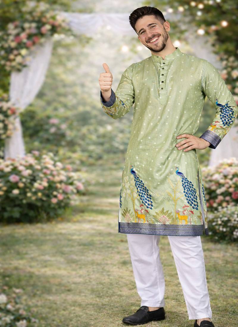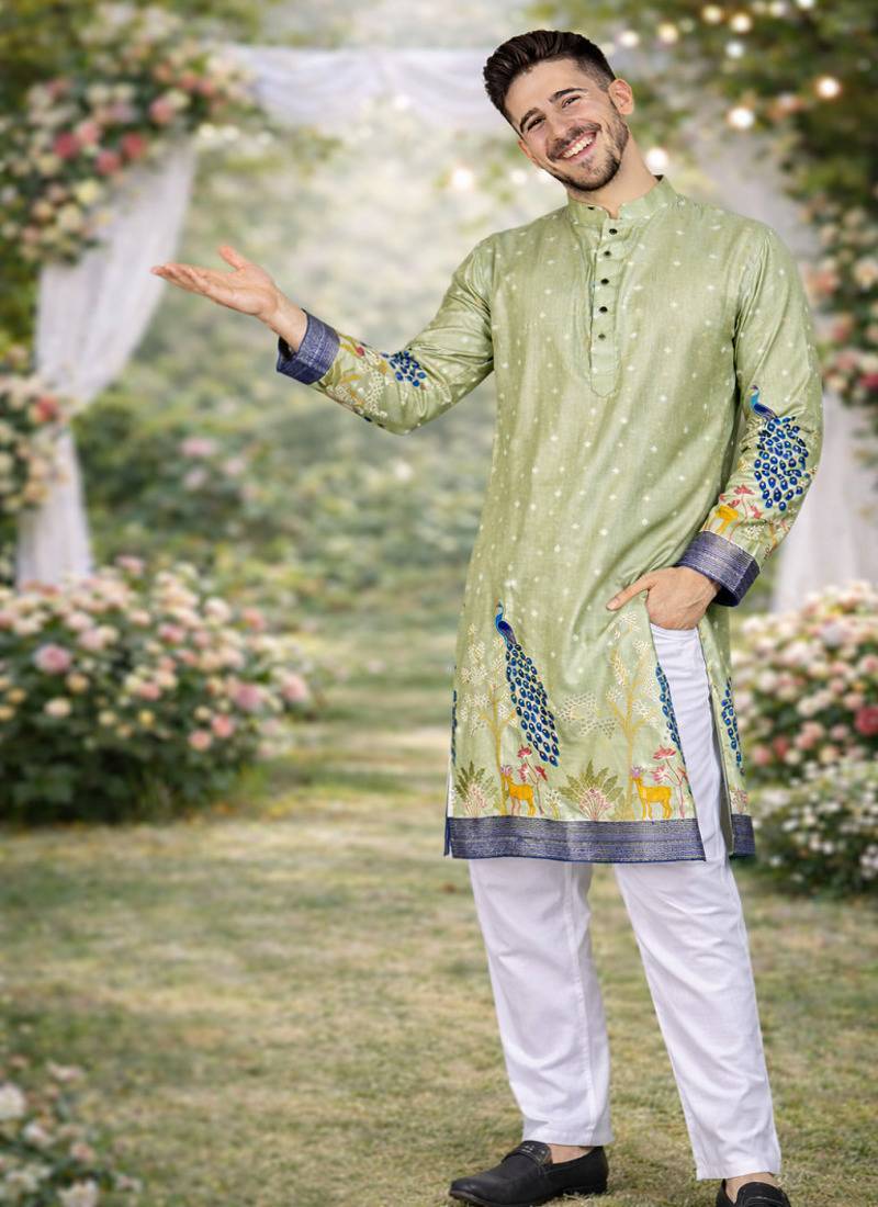 Product Name Pista Green Patola Foil Print Dola Silk Kurta Pajama Set For Men | Wedding & Festive Wear