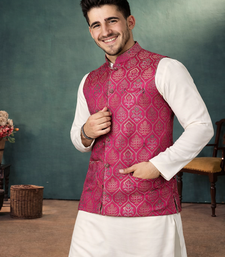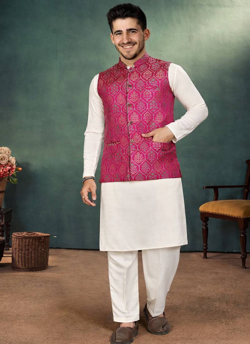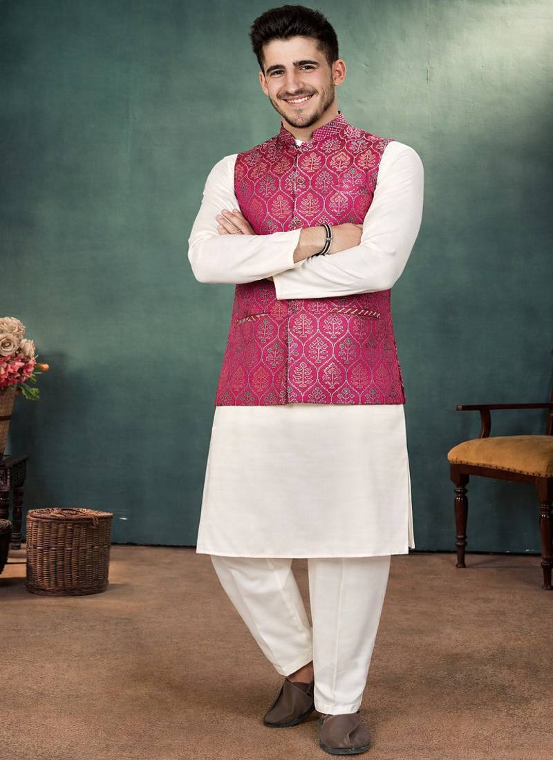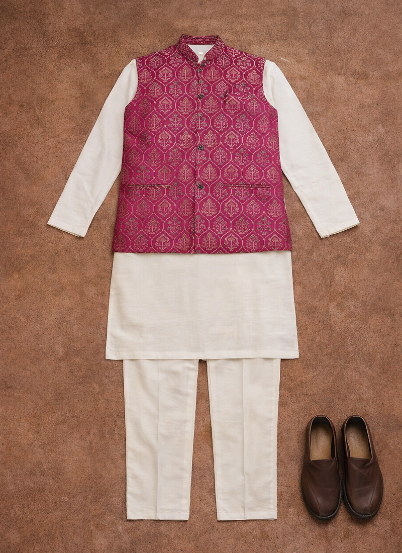 | Product Description | This Set Includes A Rani Pink Silk Blend Koti With Intricate Jacquard Weaving Paired With A Cotton Kurta And White Cotton Payjama. The Kurta Features A Round Neck And Full Sleeves, Designed For A Traditional Appearance. The Koti Displays Woven Nehru Jacket And Zari Detailing, Creating Textured Elegance. The Cotton Payjama Provides Comfort And Breathability, Balancing The Richer Top Fabrics. Stitched And Ready To Wear, The Ensemble Maintains A Classic Silhouette Suitable For Wedding Occasions. The Combination Of Cotton And Silk Blend Fabrics Ensures Structure In The Koti While Offering Soft, Breathable Comfort In The Kurta And Bottoms. |