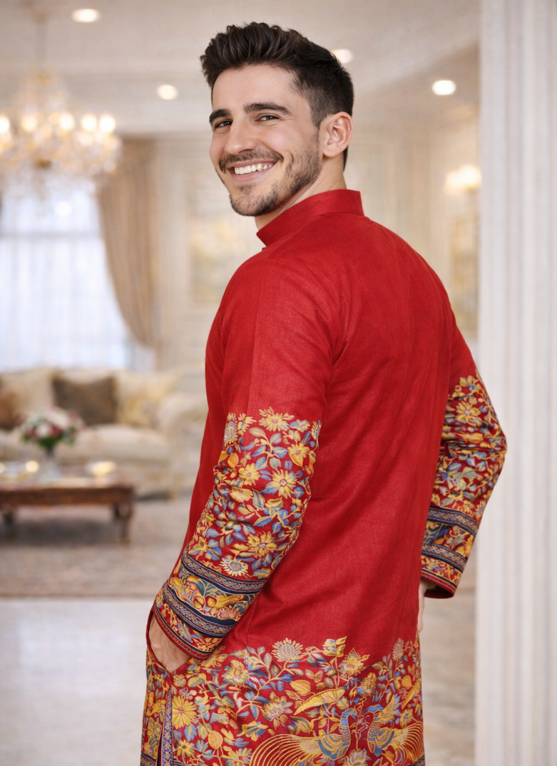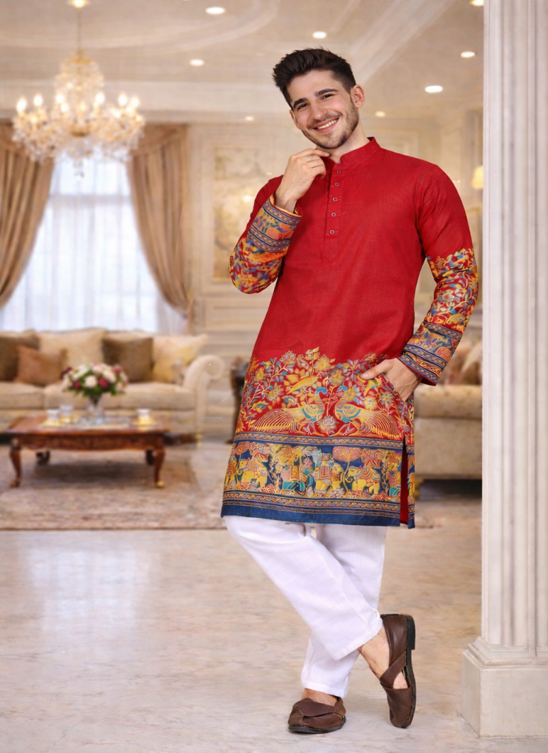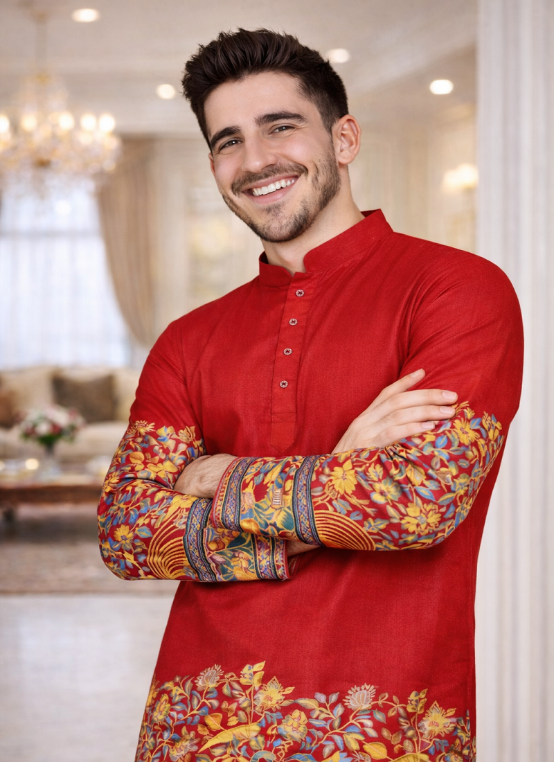 | Product Description | Red Color Kurta Pajama Set Made From Dola Silk Fabric That Gives A Smooth And Rich Finish. The Kurta Features A Beautiful Patola Design With Foil Print Work, Especially Highlighted On The Sleeves, Adding A Traditional And Stylish Look To The Outfit. The Red Color Gives A Fresh And Graceful Appearance. The Set Comes With A Matching Pajama, Making It A Complete Outfit For Festive Wear, Weddings, And Family Functions. Red Color Patola Foil Print Work Dola Silk Kurta Pajama Set Is Comfortable To Wear And Perfect For Special Occasions And Celebrations. |
