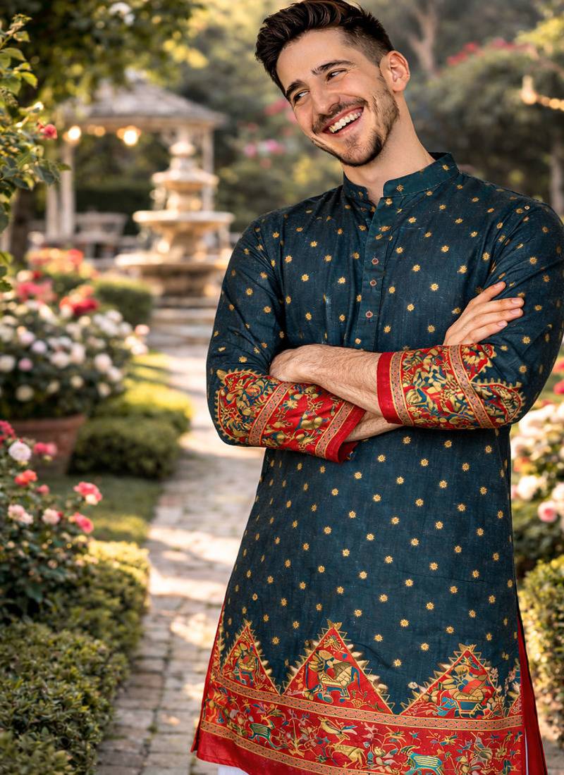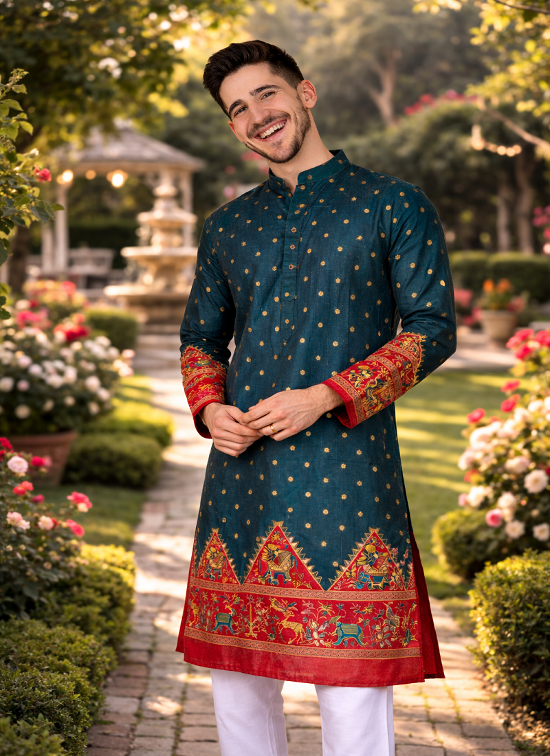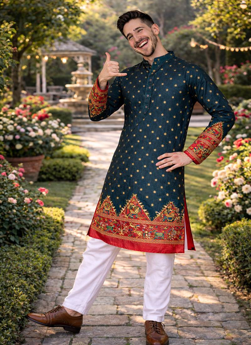 This Set Features A Teal Dola Silk Kurta With Patola Foil Print Work, Paired With A White Raymond Cotton Payjama. The Kurta Has A Round Neck And Full Sleeves, Designed With A Traditional Silhouette. The Foil Print Adds Textured Detailing Across The Silk Blend Fabric, While Subtle Zari Accents Enhance The Overall Look. The Cotton Payjama Ensures Breathable Comfort And A Balanced Fit With The Structured Kurta. The Outfit Is Stitched And Includes One Kurta And One Payjama. The Combination Of Silk And Cotton Fabrics Provides Both Elegance And Practicality. The Set Maintains A Classic Traditional Style Suitable For Wedding Occasions.