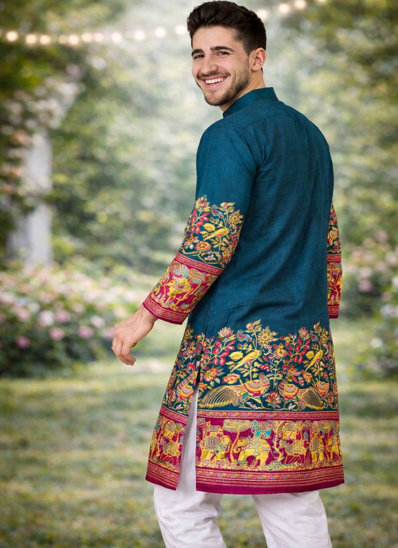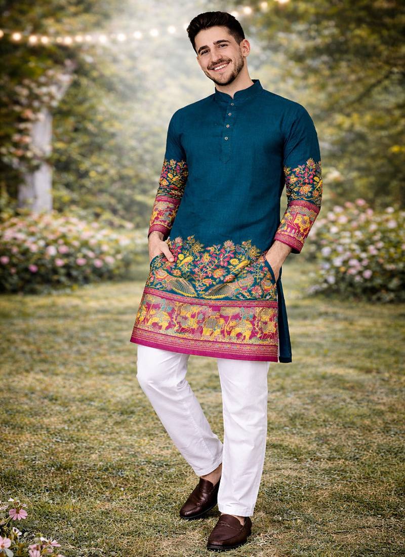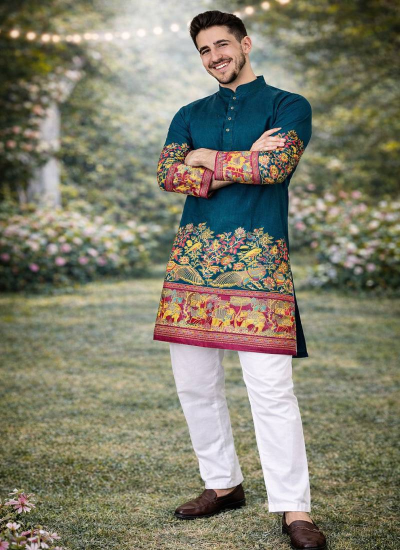 | Product Description | Make A Bold Ethnic Statement With This Striking Teal Patola Foil Print Kurta Pajama Set, Crafted For Modern Men Who Appreciate Vibrant Tradition. The Rich Teal Shade Adds Depth And Elegance, Making It A Perfect Pick For Festive Celebrations, Weddings, And Special Occasions. Tailored In Premium Dola Silk, The Kurta Showcases Intricate Patola Inspired Foil Print Work That Brings A Luxurious Sheen And Artistic Detailing. The Beautifully Designed Border Featuring Traditional Motifs And Vibrant Accents Enhances The Overall Royal Appeal, While The Detailed Sleeve Work Adds A Stylish Finishing Touch. Paired With A Soft And Breathable Cotton Pajama, This Ensemble Ensures Maximum Comfort Along With Standout Style. Team It With Mojaris Or Ethnic Footwear To Complete A Refined And Eye Catching Traditional Look. |