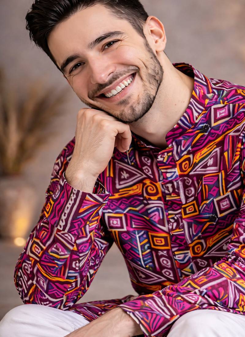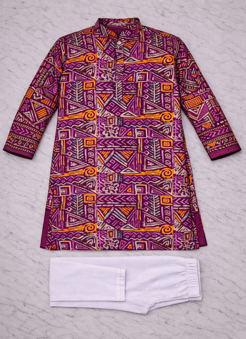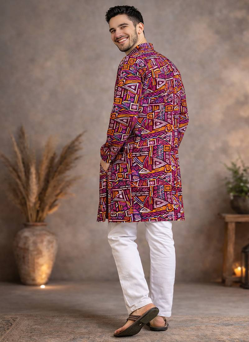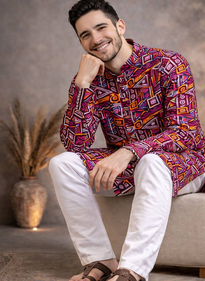 Make A Bold Style Statement With This Striking Wine Geometric Foil Print Kurta Pajama Set, Crafted For Men Who Love Standout Ethnic Fashion. The Rich Wine Base Is Enhanced With Vibrant Multicolour Abstract And Geometric Patterns, Giving It A Modern, Artistic Edge Perfect For Festive Events And Evening Occasions.