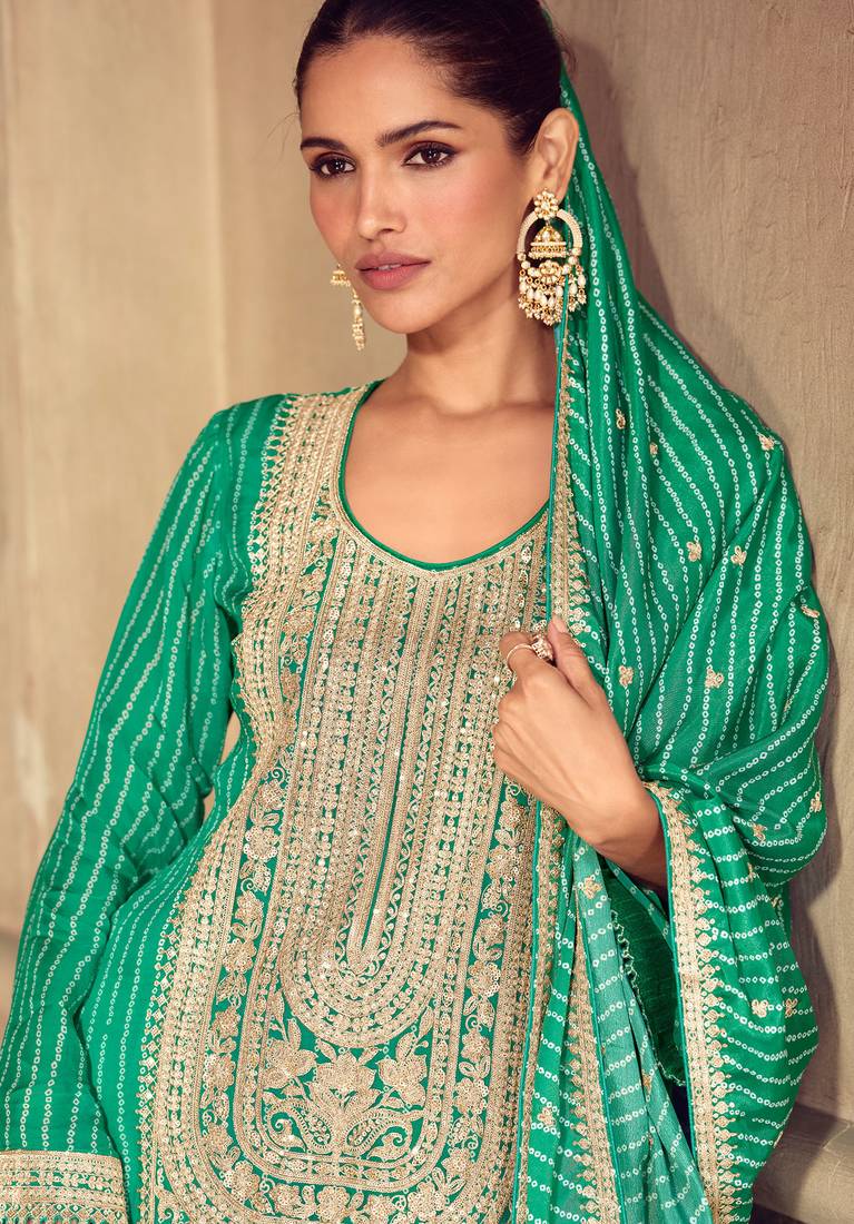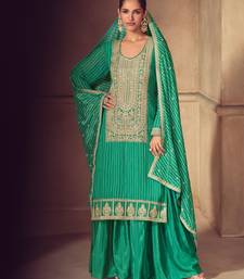 Green embroidery, zari, sequins work & digital print chinnon straight palazzo suit - free size stitching (size upto 42") stitched