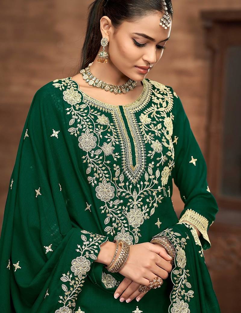 | Product Name | Green Vichitra Silk Zari Embroidery Beads Sequence Work & Floral Printed Free Size Stitch Suit Size Up To 42 | |