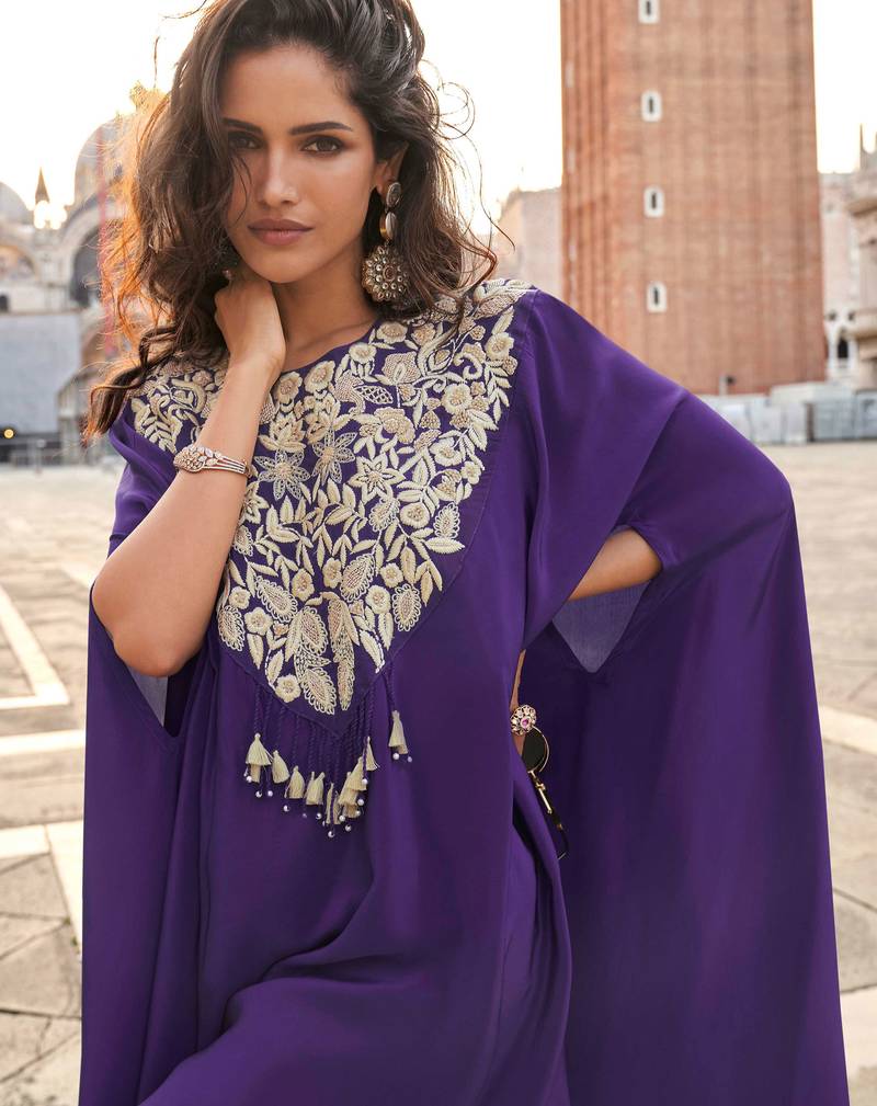 | Product Name | Purple Crepe Silk Long Sleeve Top Palazzo With Thread Zari Embroidery Beads Stones & Sequins Full Stitched Free Size | |