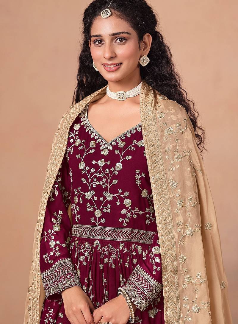 | Product Name | Maroon Georgette Zari Embroidery & Sequins Semi Stitched Suit Size Up To 42 | |