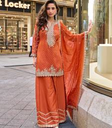 | Product Name | Orange Viscose Simmar Straight Kurta Pant Suit With Heavy Golden Zari Embroidery And Sequin Work Full Stitched Free Size | |