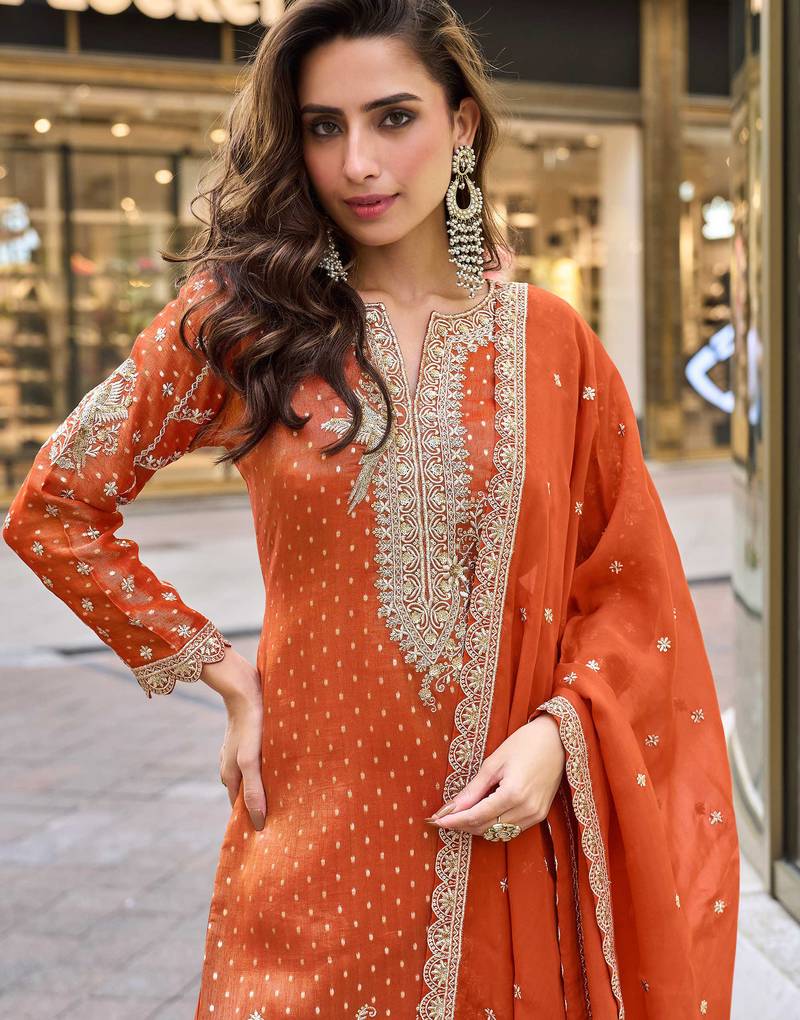 Orange viscose simmar straight kurta pant suit with heavy golden zari embroidery and sequin work full stitched free size