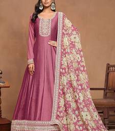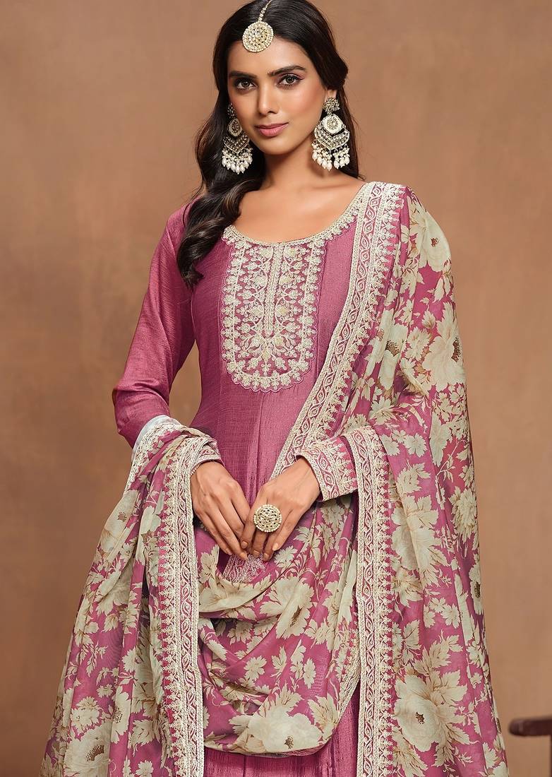 Pink art silk embroidery print & sequins semi stitched suit size up to 42