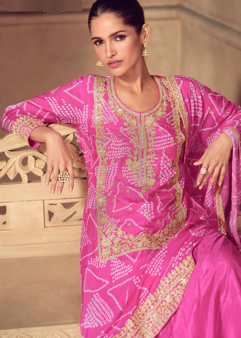 | Product Name | Pink Embroidery, Zari, Sequins Work & Digital Print Chinnon Straight Palazzo Suit Free Size Stitching (Size Upto 42") | |