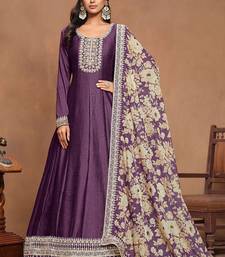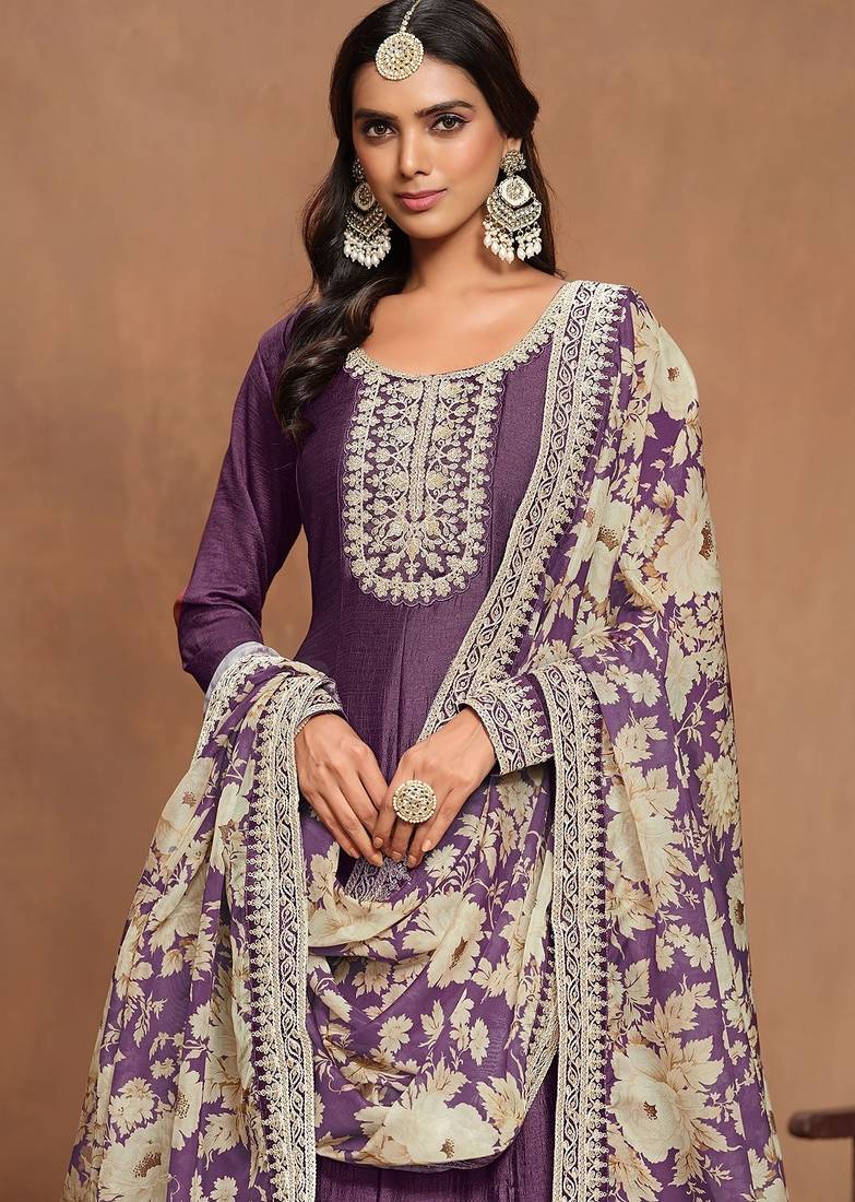Purple art silk embroidery print & sequins semi stitched suit size up to 42