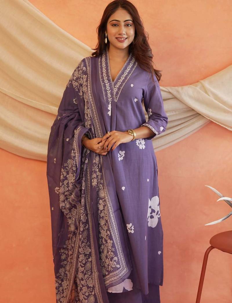 | Product Name | Purple Chinnon Zari Embroidery & Sequins Free Size Stitch Suit Size Up To 42 | |