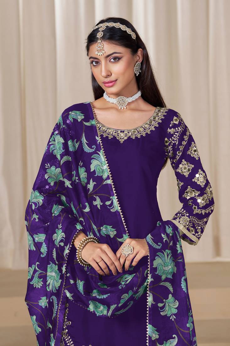 Purple roman silk embroidery sequins original glass work & printed dupatta semi stitched suit size up to 42