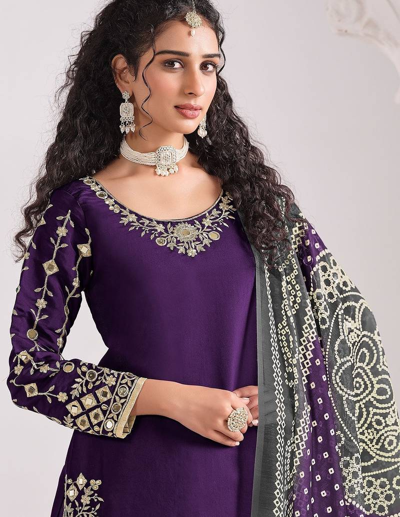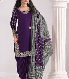 Purple roman silk zari embroidery sequins mirror & printed dupatta semi stitched suit size up to 42