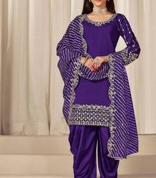 Purple roman silk zari embroidery work glass & sequins semi stitched suit size up to 42