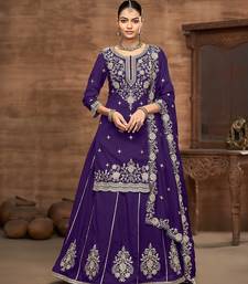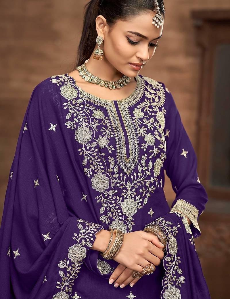 | Product Name | Purple Vichitra Silk Zari Embroidery Beads Sequence Work & Floral Printed Free Size Stitch Suit Size Up To 42 | |