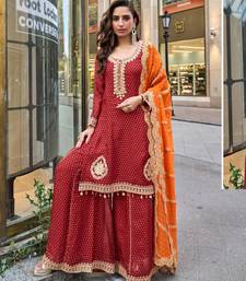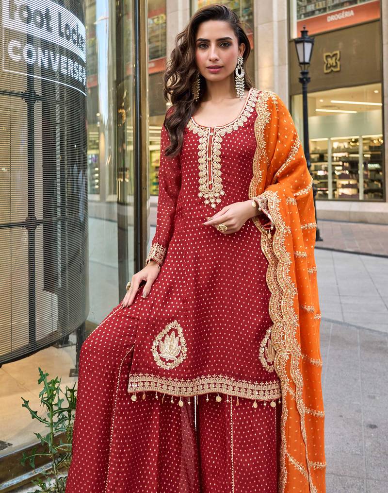 | Product Name | Red Viscose Simmar Straight Kurta Pant Suit With Heavy Golden Zari Embroidery And Sequin Work Full Stitched Free Size | |