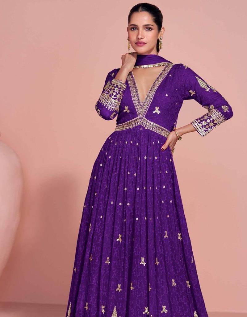 Royal purple golden embroidery sequins thread work gerogette anarkali gown-full stitched free size
