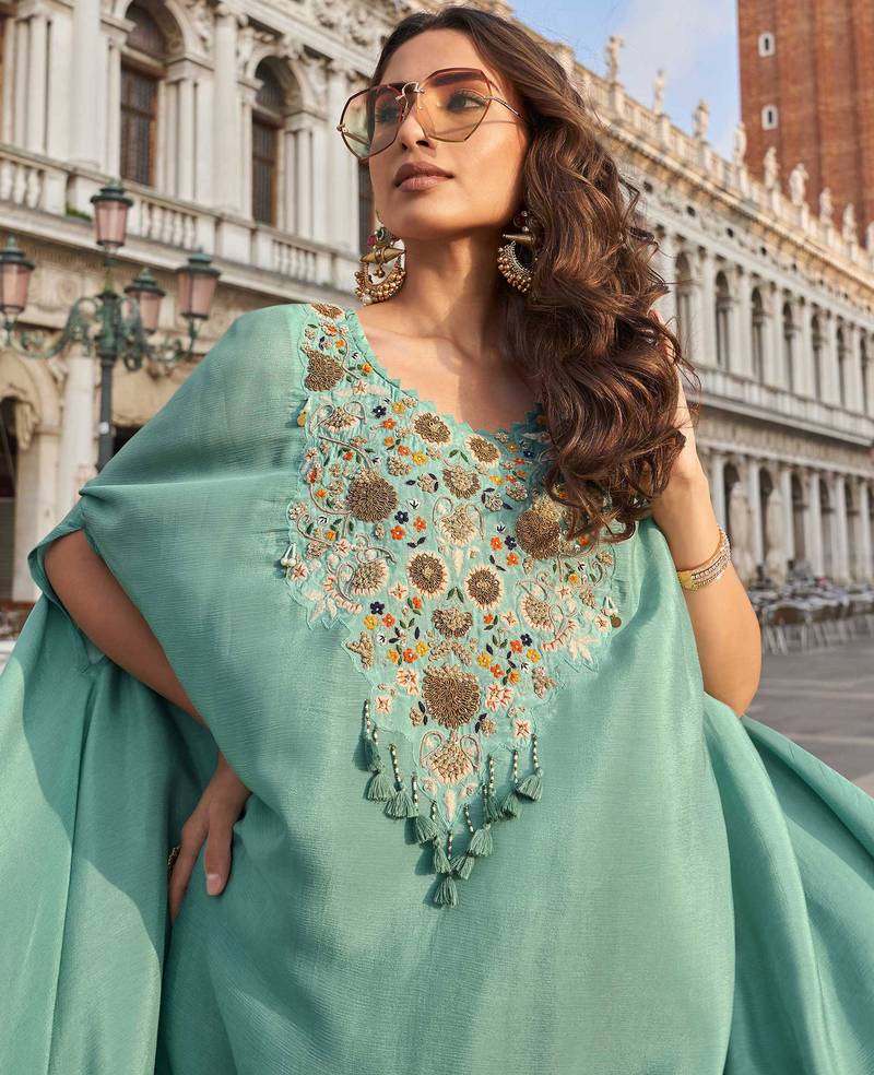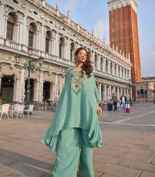 Sea green crepe silk top palazzo with thread-zari embroidery beads stones and sequin-full stitched free size