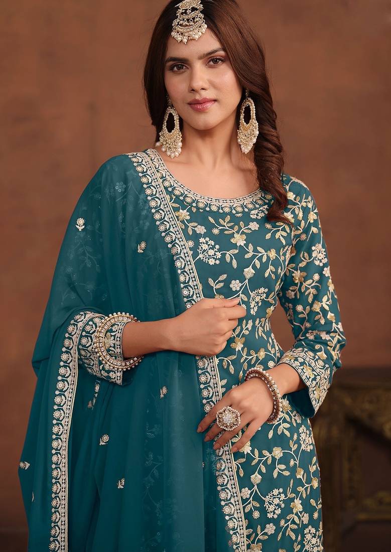 | Product Name | Teal Blue Georgette Embroidery & Sequins Semi Stitched Suit Size Up To 42 | |