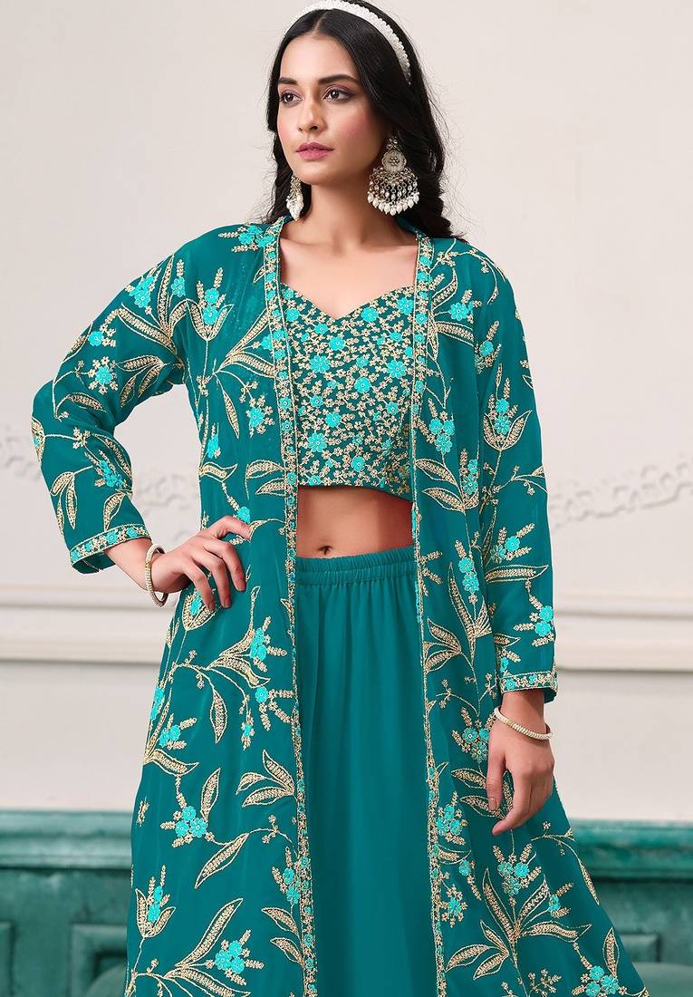 | Product Name | Turquoise Blue Georgette Zari Embroidery & Sequins Free Size Stitch Suit Size Up To 42 | |