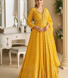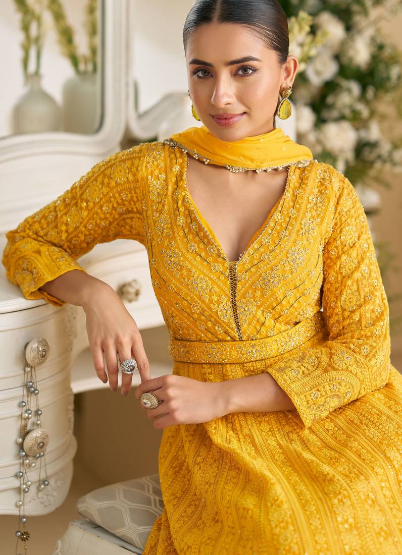 Yellow georgette sequins readymade suits free size up to 42 stitched