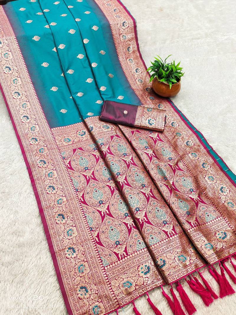 | Product Name | Sea Green Soft Banarasi Silk Saree With Zari Weaving Meenakari Design | |