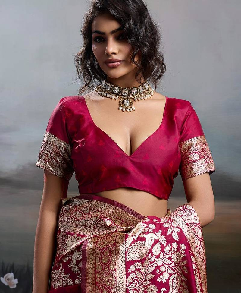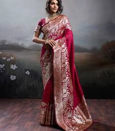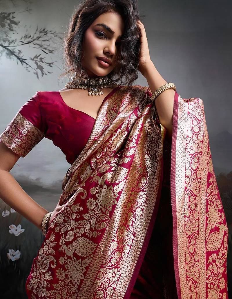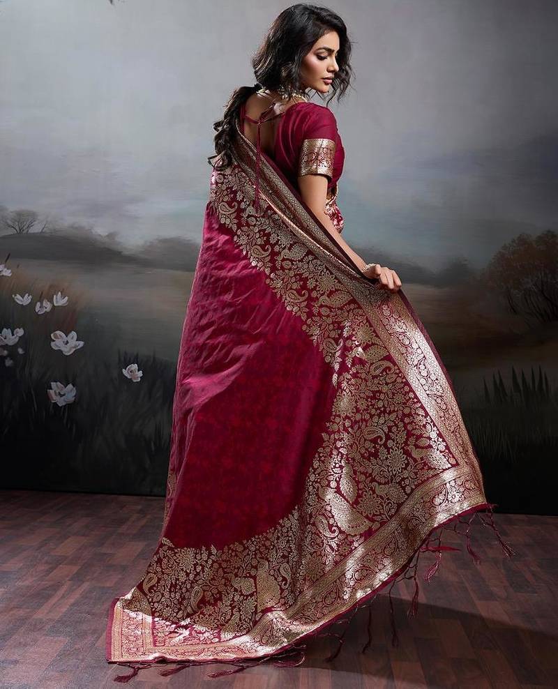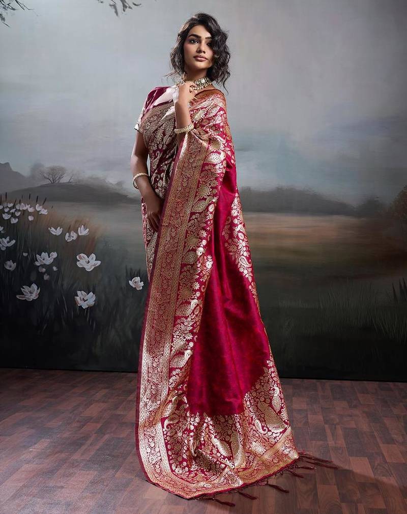 Maroon color silk blend zari weaving work saree with blouese
