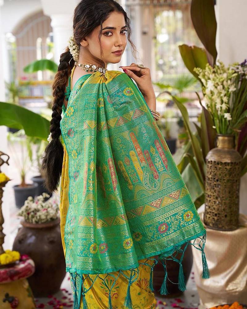 Musturd yellow color woven work soft silk party wear saree with blouse