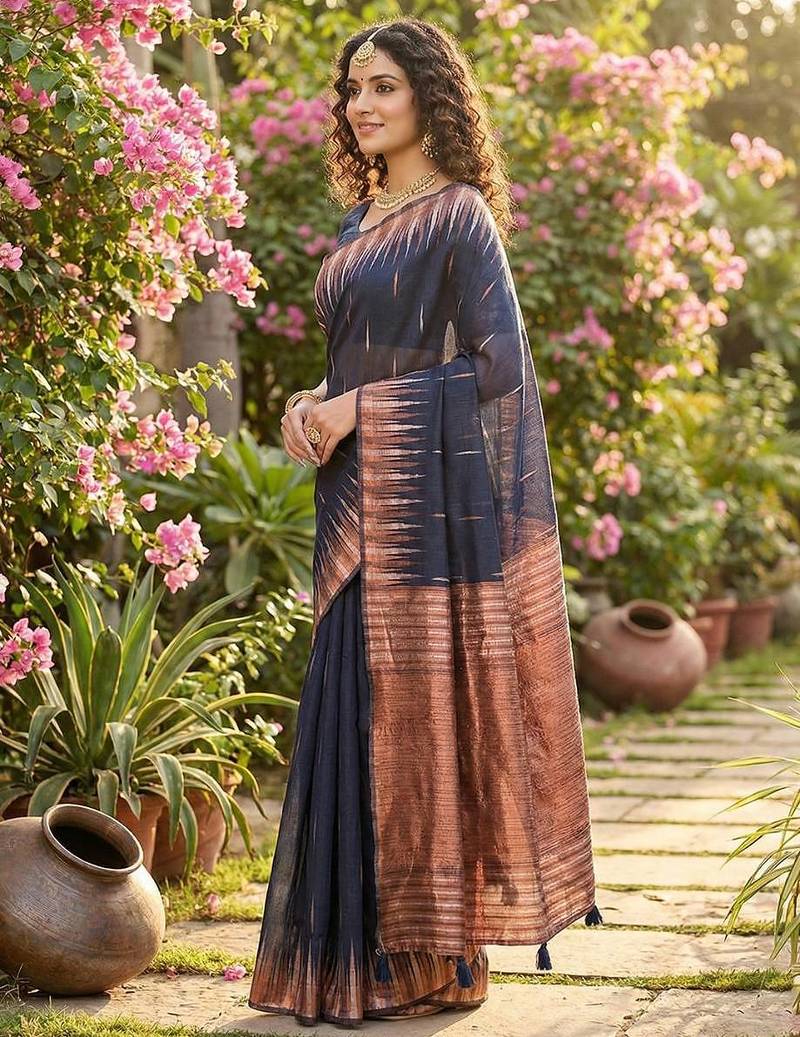 | Product Name | Navy Blue Color Temple Border Zari Woven Linen Cotton Saree | |