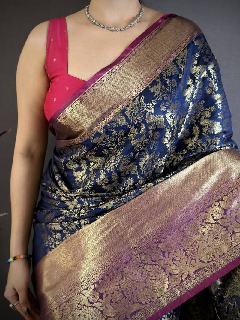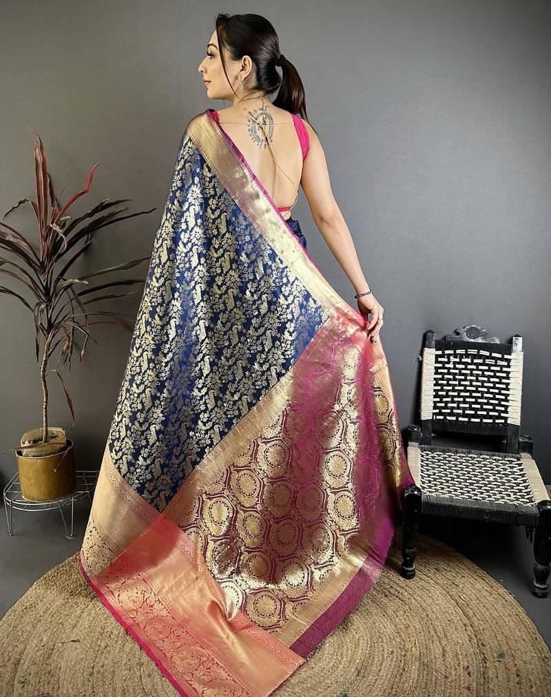Navy blue color zari weaving work kanjivaram katan silk saree with blouse