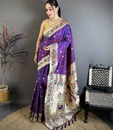 Purple color zari woven paithani silk saree with blouse