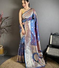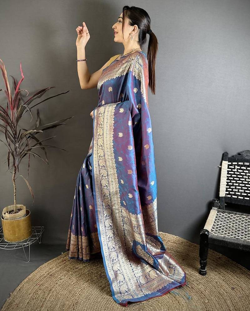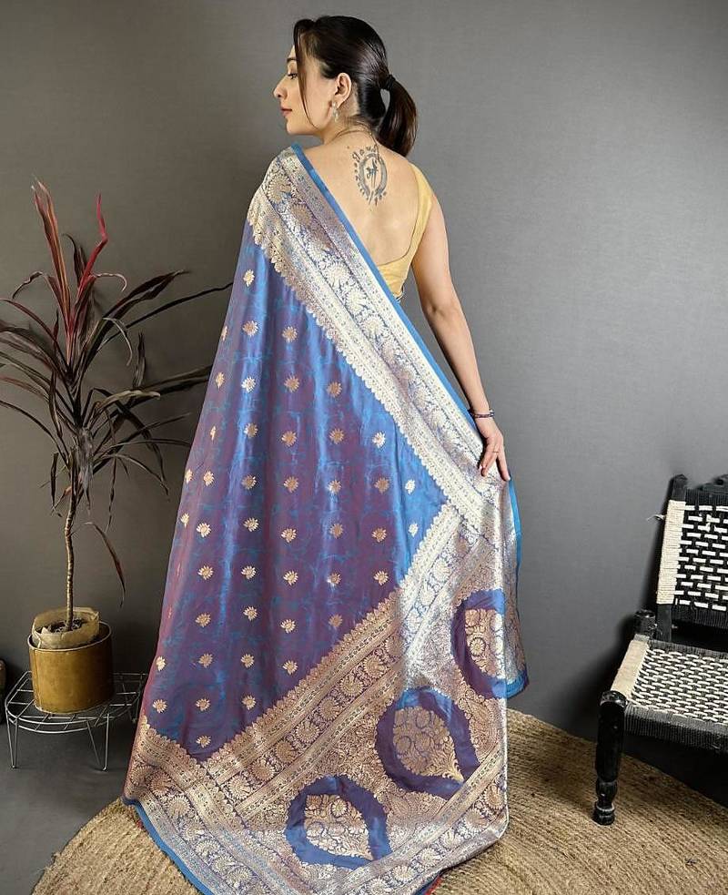 Product Name Sky & Purple Color Zari Woven Banarasi Silk Saree With Blouse