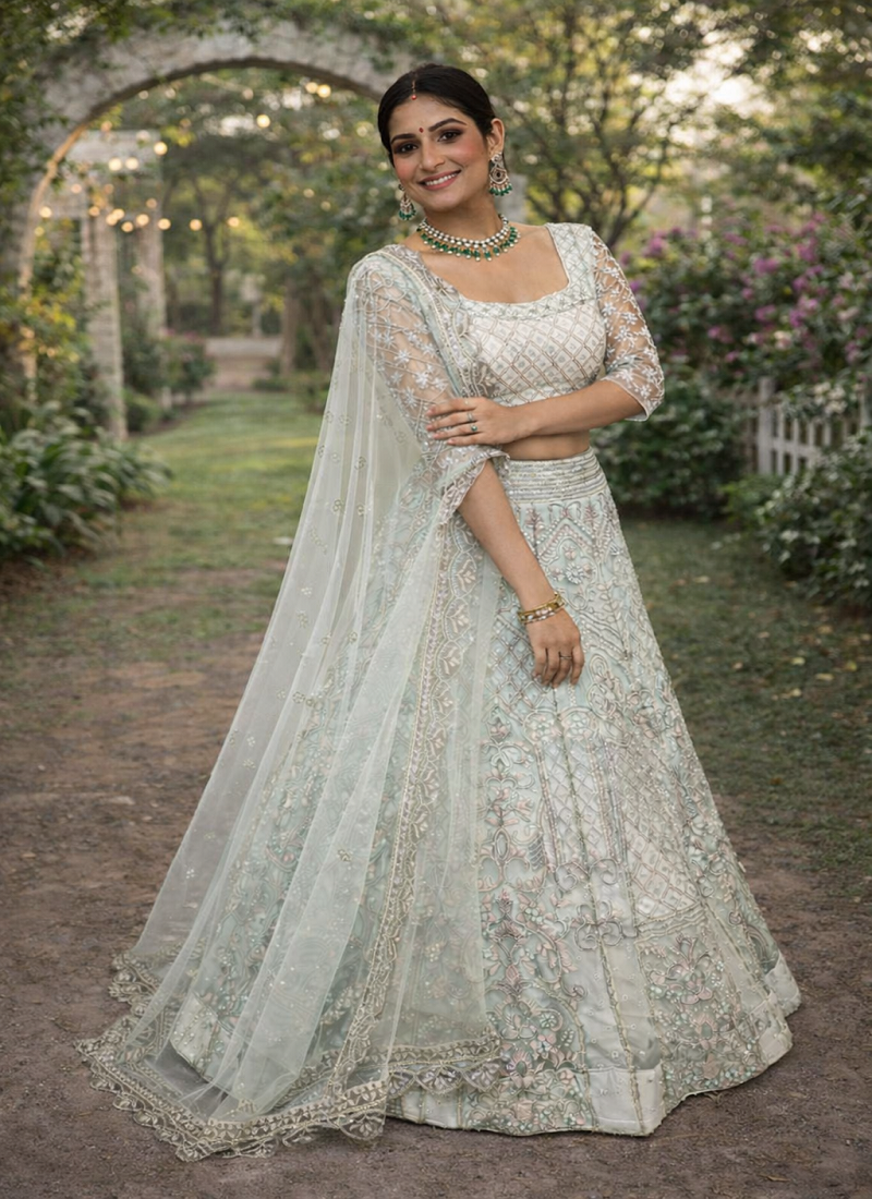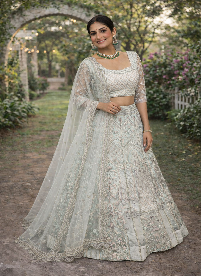 Light sky blue color embroidery sequins work butterfly net lehenga choli dupatta set
