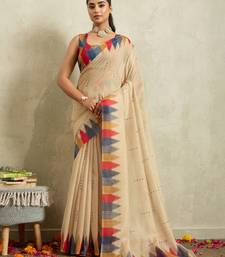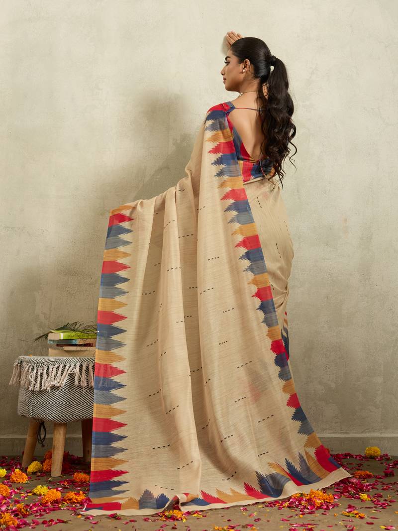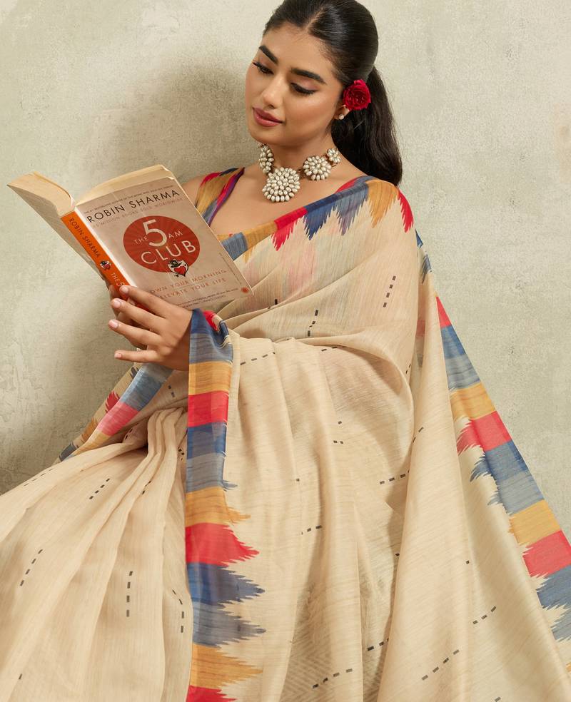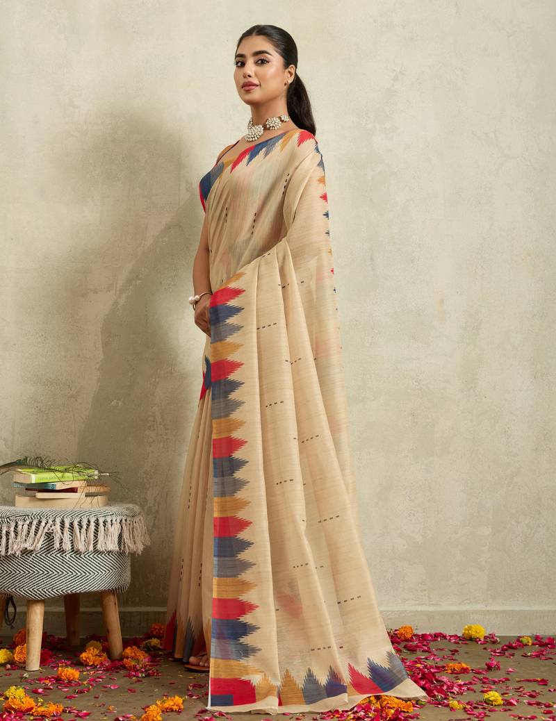 Cream ikat cotton silk ethnic causal wear saree with blouse