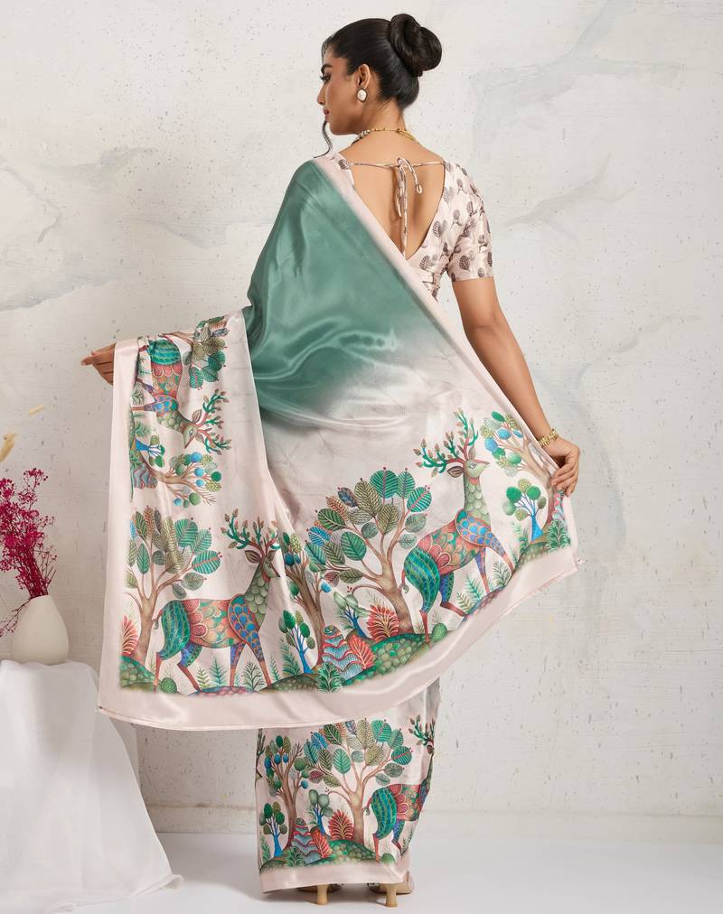 Green kalamkari print chiffon ethnic causal wear saree with blouse