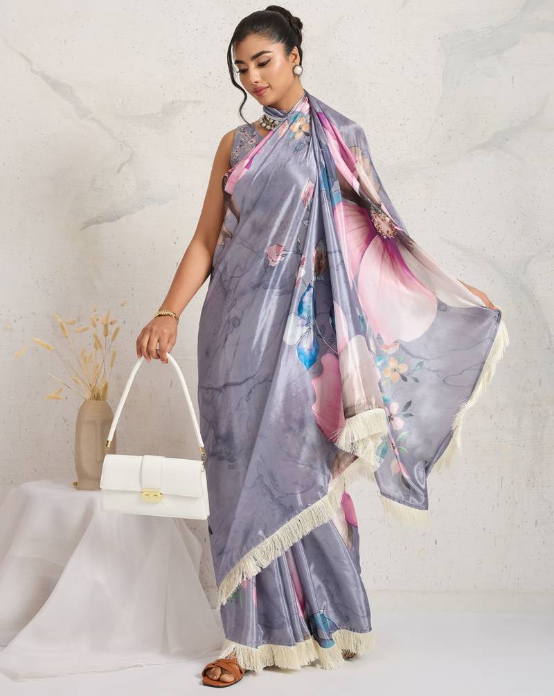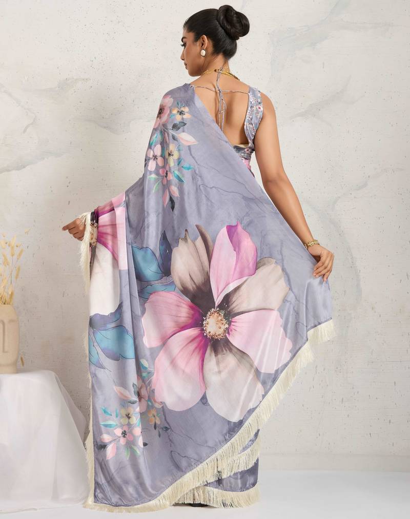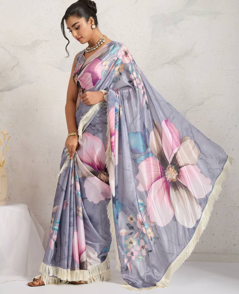 | Product Name | Grey Floral Print Silk Ethnic Causal Wear Saree With Blouse | |