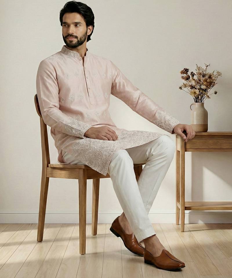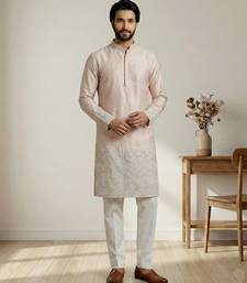 Peach designer festive wear satin kurta-pajama