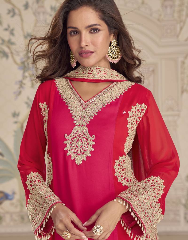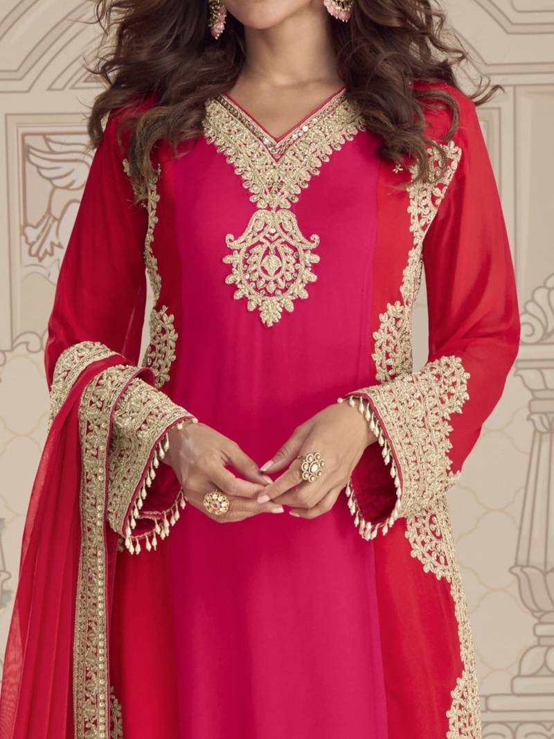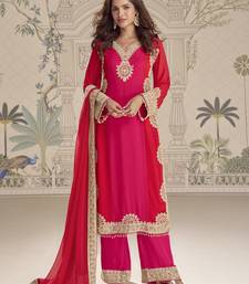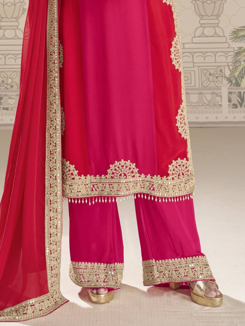 Pink red embroidered georgette semi-stitch palazzo suit with dupatta semi stitched