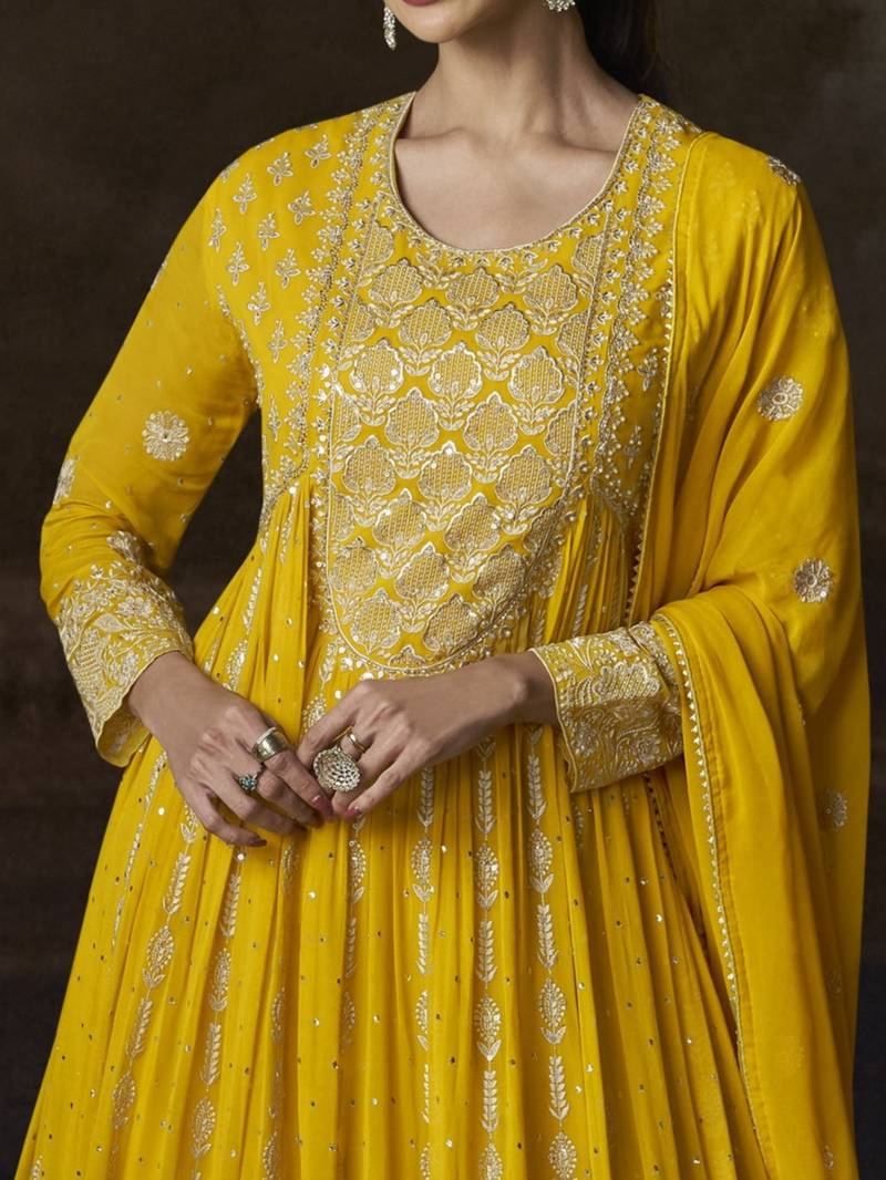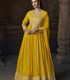 Yellow embroidered georgette semi-sttich wedding wear gown style with dupatta semi stitched