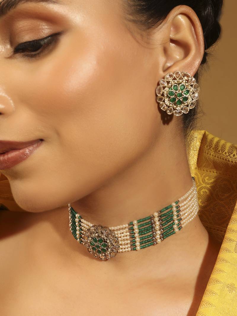 | Product Name | Delightful Pearl Round And Flower Shape Silver Plated Collar Necklace Set For Women And Girls | |