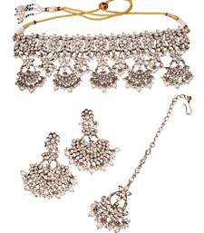 | Product Description | Splendid Flower Design And Chandelier Shape White Uncut Kundan Stone Antique Gold Plated Choker Necklace Set With Maang Tikka For Women And Girls Is Made Of Brass Will Give You Astonishing Charm And Super Comfort.