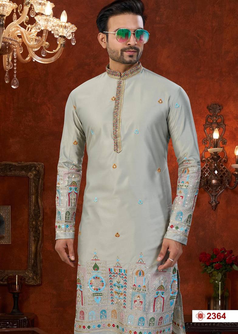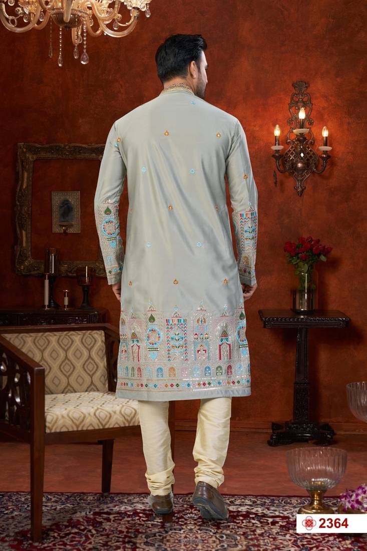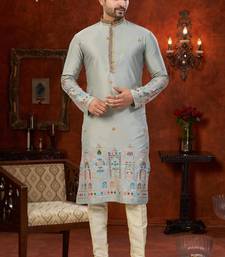 | Product Name | Gray Soft Silk With Flower Booti & Daman Amrodery Work With Thred And Less Work Kurta Pajama Set | |
