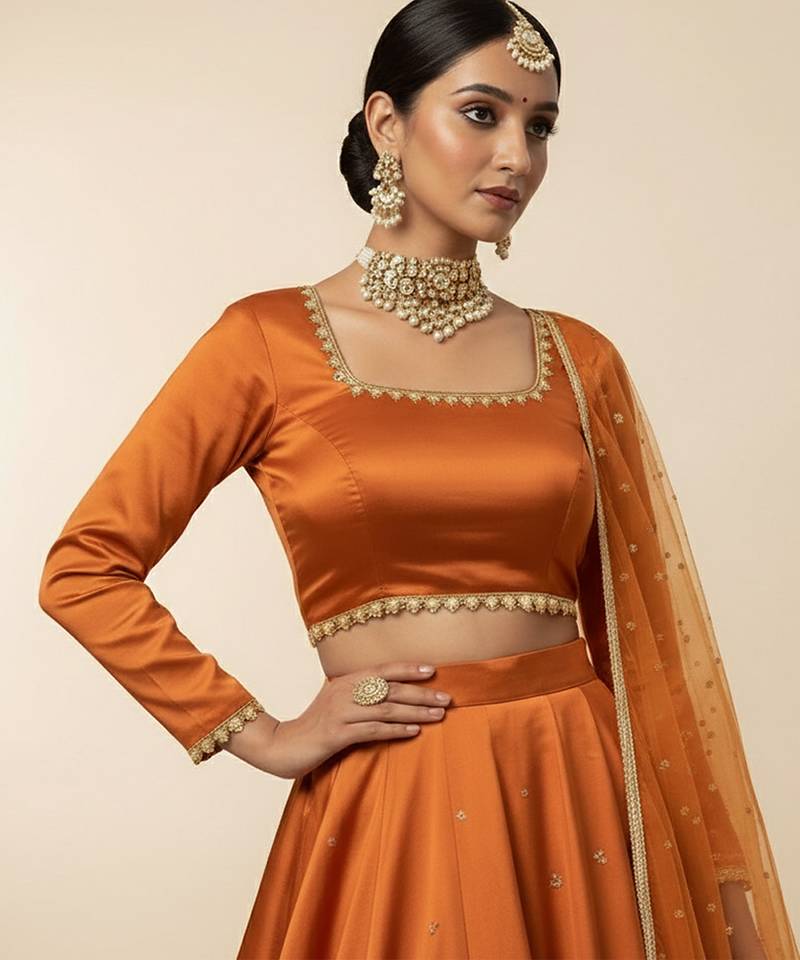 | Product Description | Vibrant Orange Organza Paired With Fine Embroidery Makes This Lehenga Set Lively And Elegant. The Lightweight, Sheer Texture Adds Volume Without Heaviness, Ideal For Festive Occasions. A Bright And Stylish Choice That Combines Youthful Charm With Graceful Traditional Appeal.