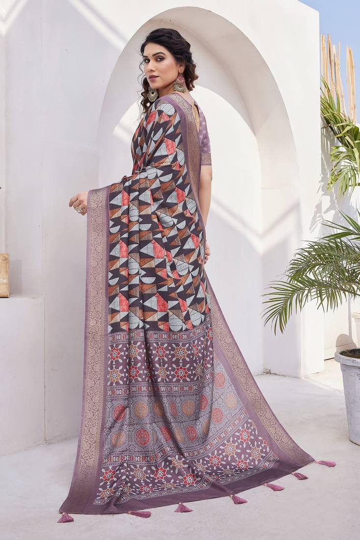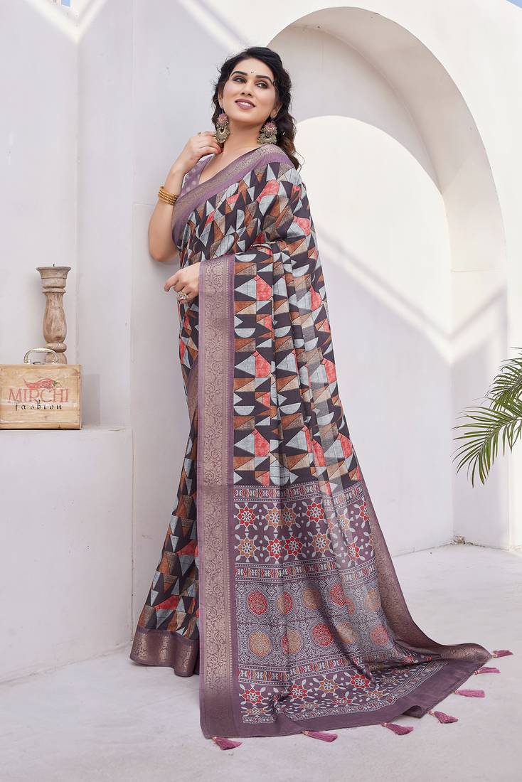 | Product Name | Wine Silk Blend Geometric Print Golden Zari Woven Border/Tassels Saree With Unstitched Blouse Piece | |