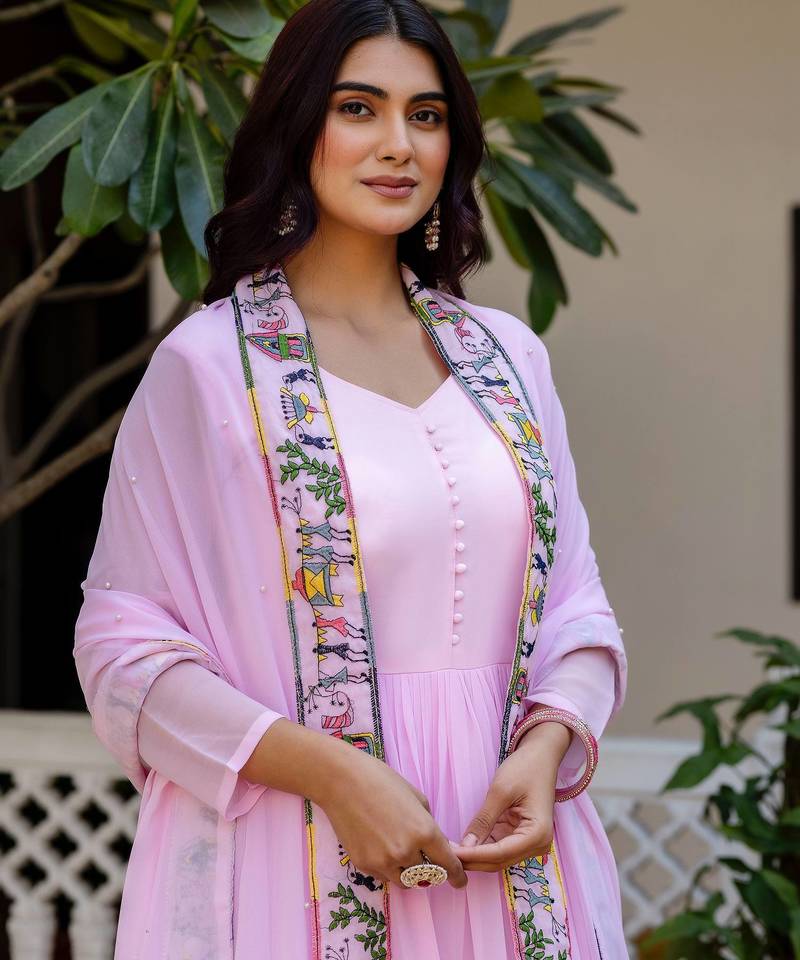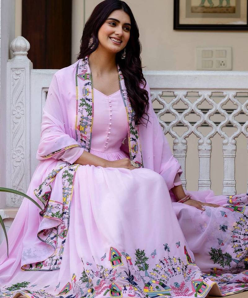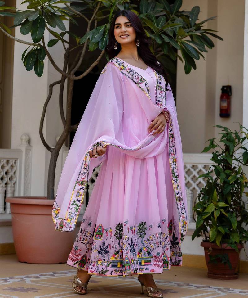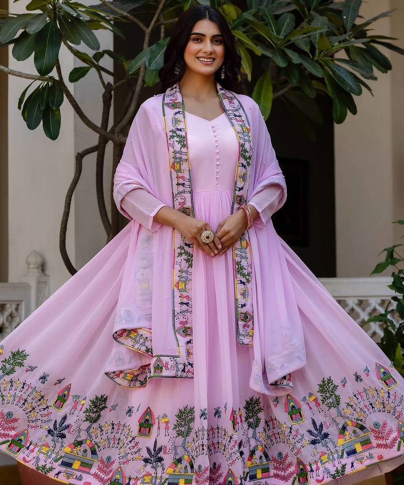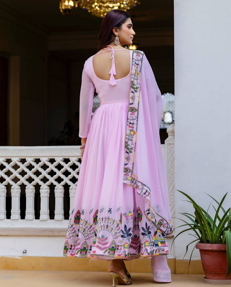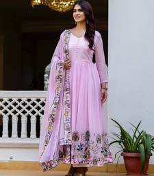 Pink color faux georgette embroidery work designer wedding wear gown stitched